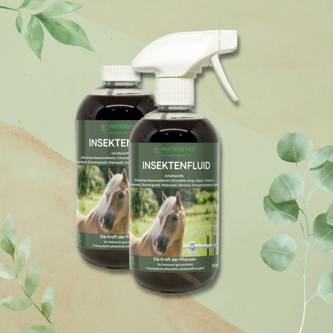 Unser Insektenfluid bietet umfassenden Schutz gegen Fliegen, Bremsen und Kribbelmücken. Die sorgfältige Mischung aus echtem Tiroler Steinöl, Bio-Nelkenöl, Essig, Citronella-Öl und weiteren hochwertigen Zutaten sorgt für eine effektive Abwehr von Insekten. Diese natürliche Formel schützt nicht nur zuverlässig vor verschiedenen Insekten, sondern pflegt auch die Haut deines Pferdes. Ideal für einen rundum wirksamen Schutz während der Insekten-Saison.