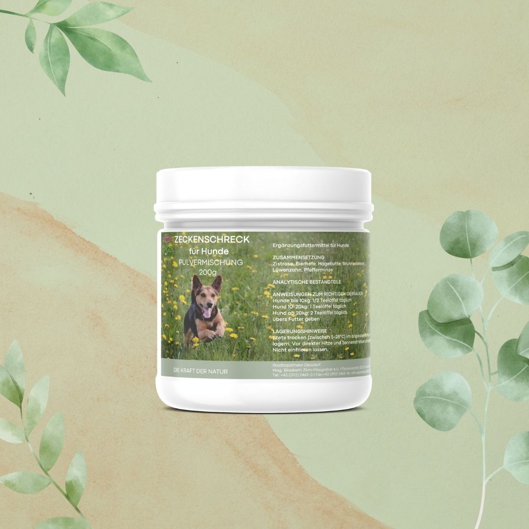 Natürlicher Schutz vor Zecken – Die Zeckenschreck Pulvermischung ist ein Nahrungsergänzungsmittel und kann einfach unter das Futter gemischt werden. Mit unserem Zeckenschreck kannst du deinen Hund von innen heraus schützen.